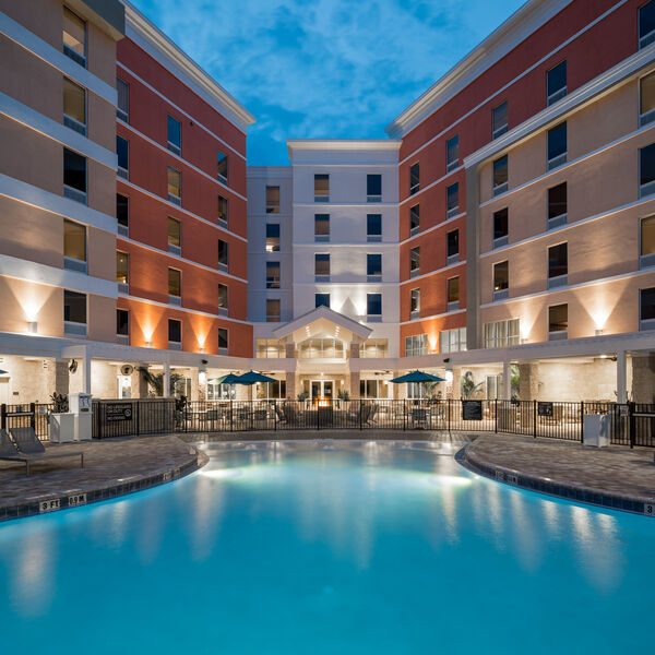 Guests enjoy spacious rooms, complimentary Wi-Fi, and a daily hot breakfast buffet served in our vibrant dining area. Relax at our resort-style outdoor pool, grab a drink at the open-air Mission Control Bar, or keep up with your routine in our fitness center featuring a Peloton® Bike with toe cages. Onsite amenities also include a 24-hour convenience store and self-parking.